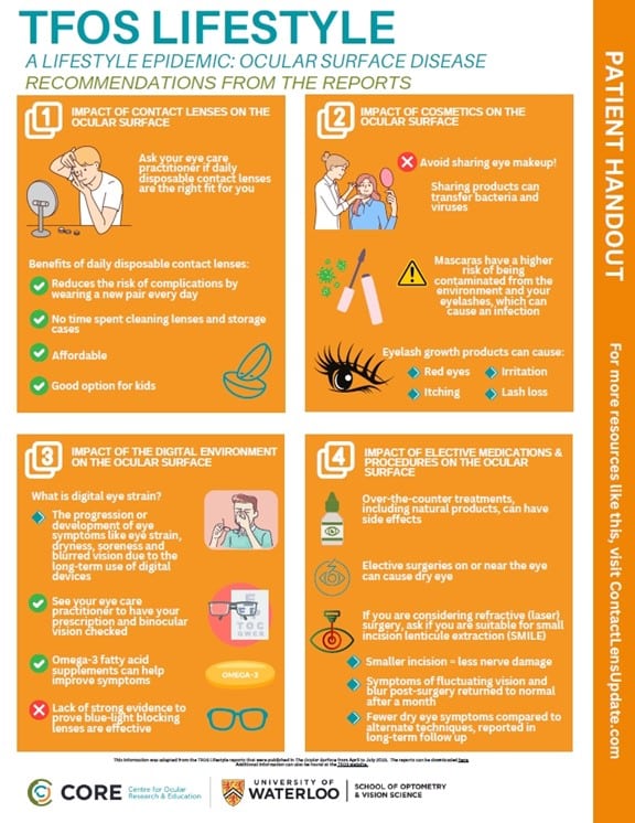 The TFOS Lifestyle Reports also provides information on digital eye strain and digital device use, and discusses how food, beverages, and elective procedures can affect the integrity of the ocular surface.