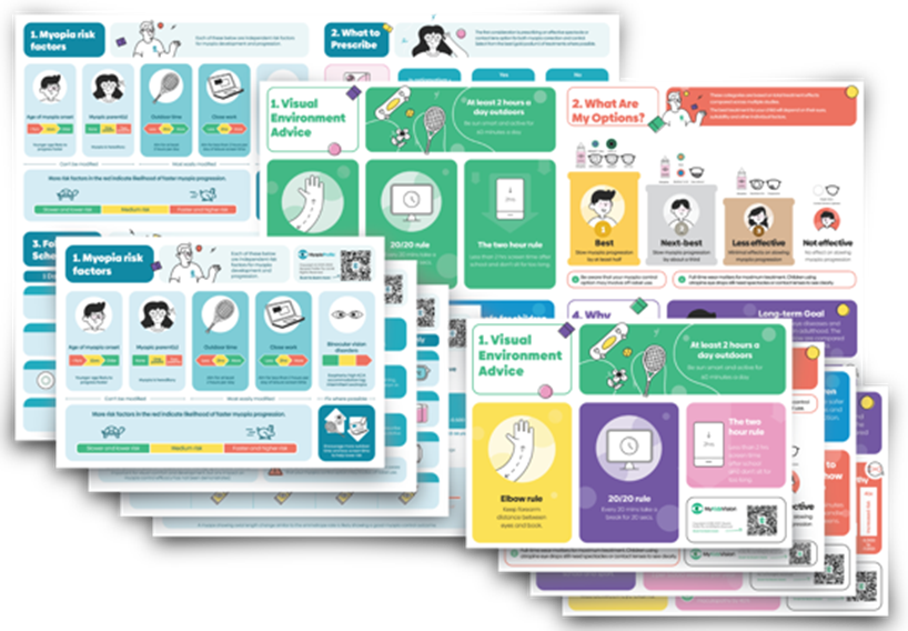 QR codes provide links from the Infographic to further information on MyopiaProfile.com for ECPs, and to MyKidsVision.org for parents and careers. It can be used as a digital display or printed in a variety of sizes for use as a practice wall poster or handheld communication tool.