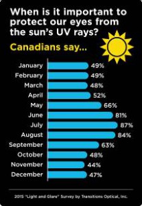 PINELLAS PARK, Fla. – Most Canadians (87 percent) think sunlight is dangerous for their eyes, but, despite this, more than half of Canadians falsely believe that you only need to protect your eyes from the sun’s UV rays in the warmer, summer months. Results from the 2015 “Light and Glare” survey from Transitions Optical, Inc.[i] show that 87 percent of Canadians agree that they should protect their eyes from the sun in July, but only 47 percent say the same for the month of December.