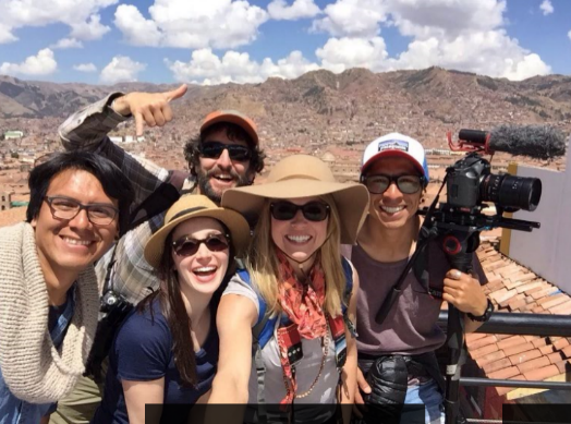 Kaleigh Nevins (brunette with hat in center) in Peru with her sister and Transitions film crew.