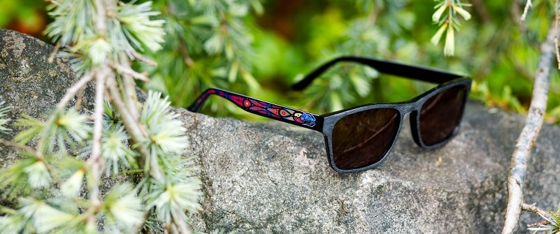 Catfish is a unisex sunglass is influenced by a classic wayfarer, refined for a more contemporary silhouette. Offered in a high gloss black with a smoke lens or a cool matt wood look with a brown lens. Ojibwe artist Donald Chretien’s artwork is beautifully captured on handmade acetate temples and colorful details extend down the full length of the temples.