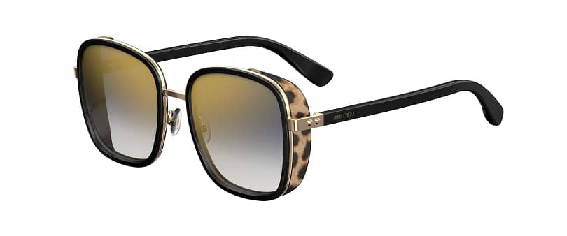An oversized square frame and graduated lenses evoke a 70s vibe. Iridescent metal rims and a lateral spoiler in leather add to the drama of the “Elva” sunglasses from Jimmy Choo. Available in the following colours: Black with gold metal rims and a leopard pony leather spoiler; Ivory with palladium metal rims and nude leather spoiler; Blue with rose gold metal rims and blue leather spoiler; Black with gold metal rims and black leather spoiler.