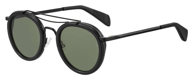 The Nomad (RNB9001/S) from rag & bone is a unisex, round metal aviator featuring handmade, matte acetate rims hand-wrapped in supple Italian leather. The vintage-inspired triple bridge and iconic dagger-shaped temples are composed in metal. High-quality, offered in matte black with green, dark ruthenium military green with red lenses, gold/black with gold mirror lenses, and black/beige with gray lenses.