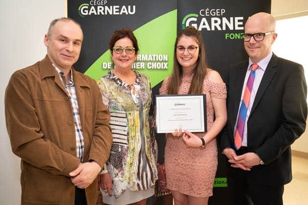 From left to right: Alain Thivierge, Chairman of the Board of Directors of the Cégep Garneau Foundation, Louise Tanguay representing Essilor Canada, Sarah-Maude Mercier D’Amours and Jean-Yves Tremblay, Assistant Director of Studies.