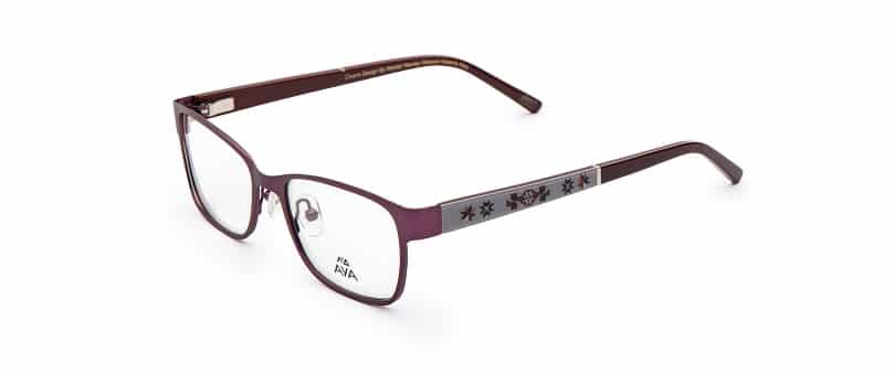 This frame was crafted to feature striking elements from the works of Master Weaver Helene Nez. The distinctly Navajo pattern is framed within the arm of the temple for a truly beautiful effect. The Helene frame itself is a unisex full rim frame and has spring hinges for added comfort. Available in a soft satin plum or soft satin black.