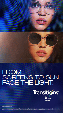 A recent Transitions Optical study found that since the beginning of the COVID-19 pandemic, 66% of prescription eyeglass wearers said they spend more time in front of digital screens and 22% of consumers report spending more time going outside into bright sunshine.