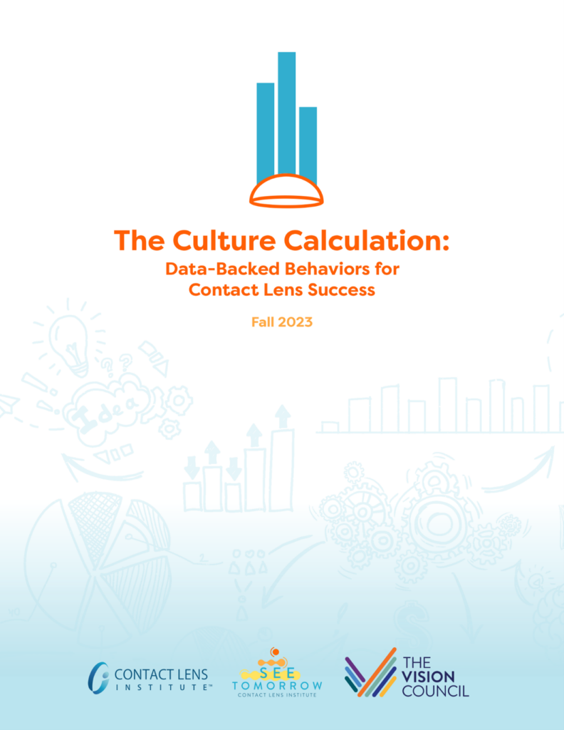 The Contact Lens Institute (CLI) today published “The Culture Calculation: Data-Backed Behaviors for Contact Lens Success” in collaboration with The Vision Council. The in-depth guide, the latest in CLI’s “See Tomorrow” research series, is designed to help eye care practices enhance their contact lens cultures, in turn increasing patient satisfaction and practice business outcomes. It can be read or downloaded for no cost in the resources section of ContactLensInstitute.org.