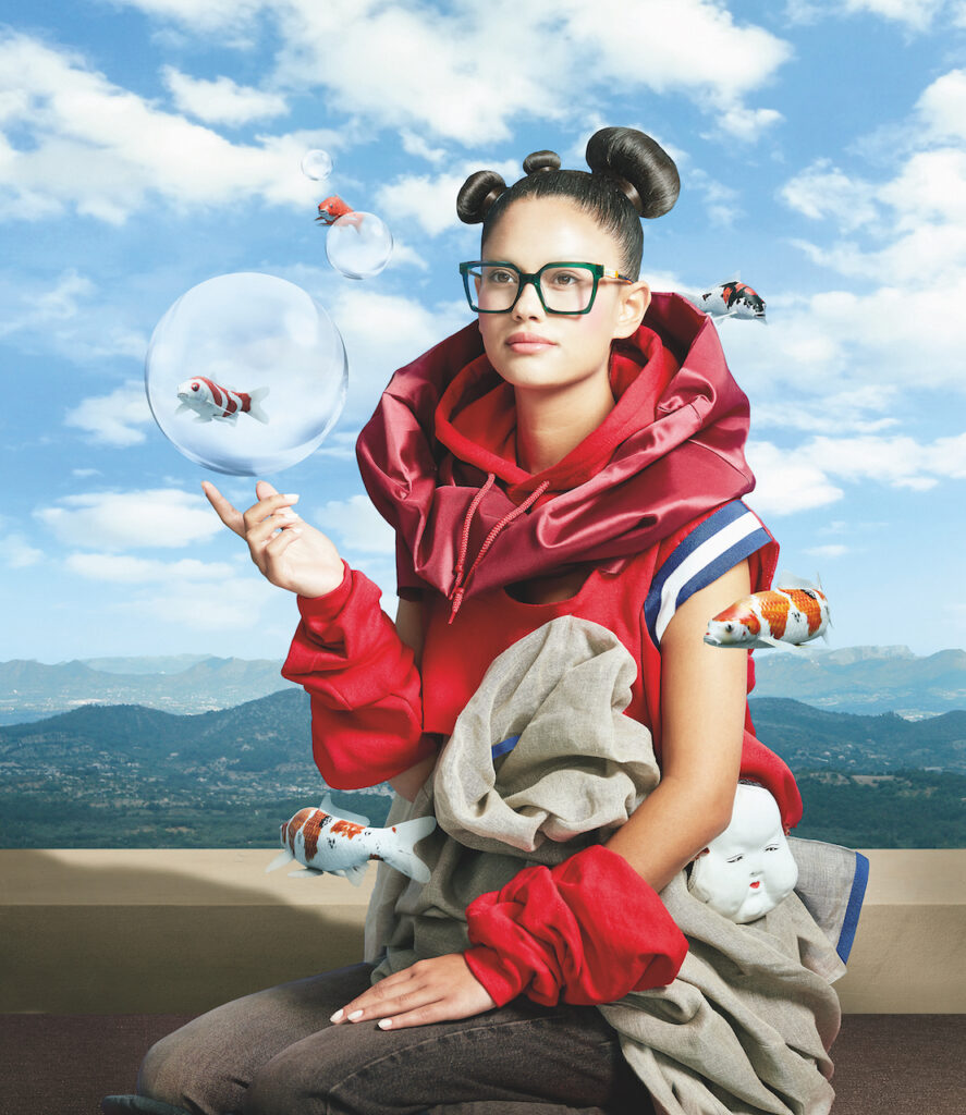 Mixed-media image showing a model wearing bold Spanish eyewear, surrounded by floating bubbles and fish, against a village hillscape.