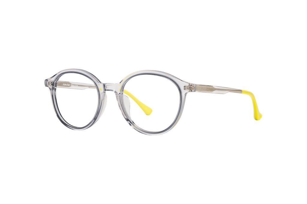 Transparent Xavier Garcia, IXO framed eyeglasses with yellow accents on the temples.