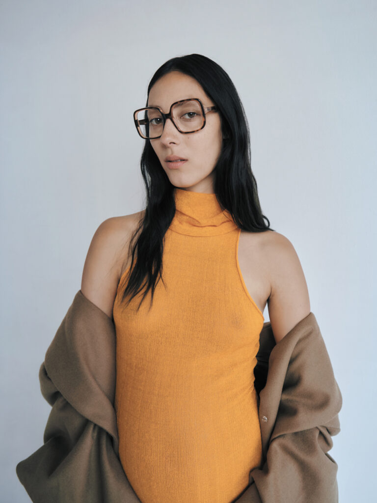 Trendy woman in an orange turtleneck and oversized GIGI STUDIOS glasses posing in a studio.