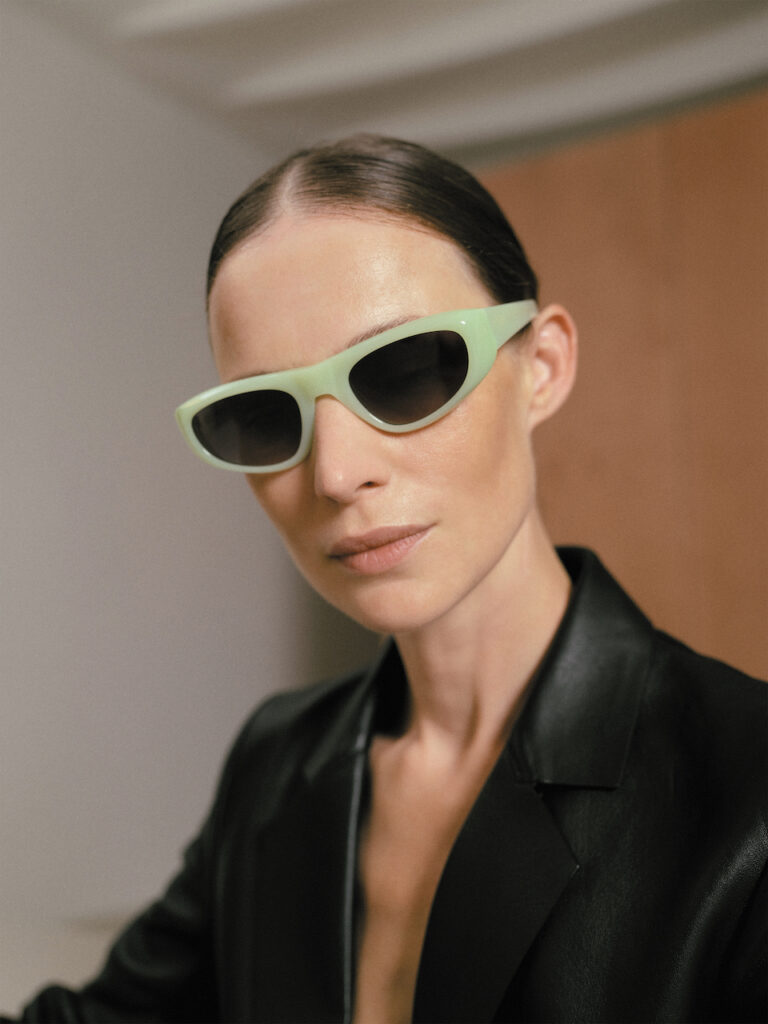 Woman in a black jacket wearing pastel green Spanish eyewear (KALEOS sunglasses).