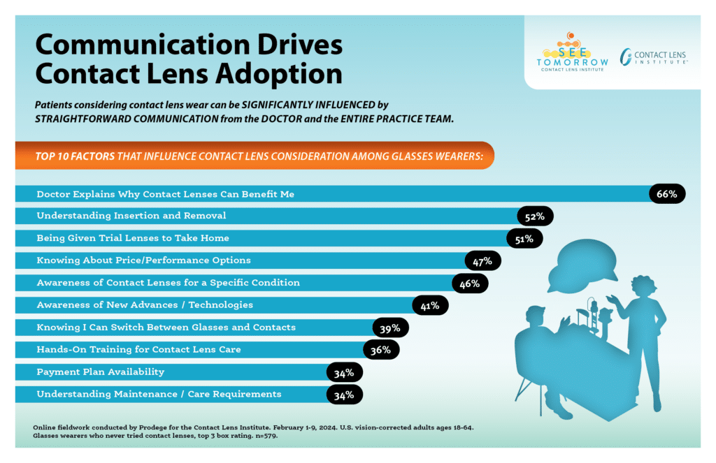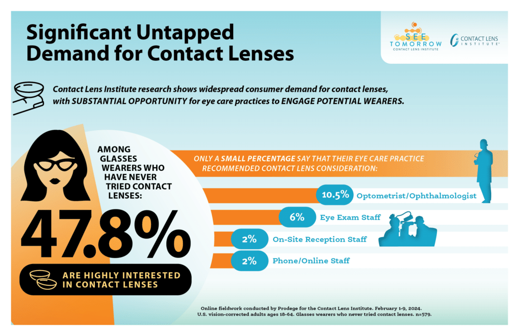 “Our research has consistently shown that vision-corrected adults are waiting for their doctors to raise the possibility of contact lens wear—a straightforward action that enhances patient satisfaction and practice success. This latest work delved even deeper into how that and other behaviors by practice teams play enormous roles in attracting or dissuading consumers from contemplating contact lenses and their many benefits.”