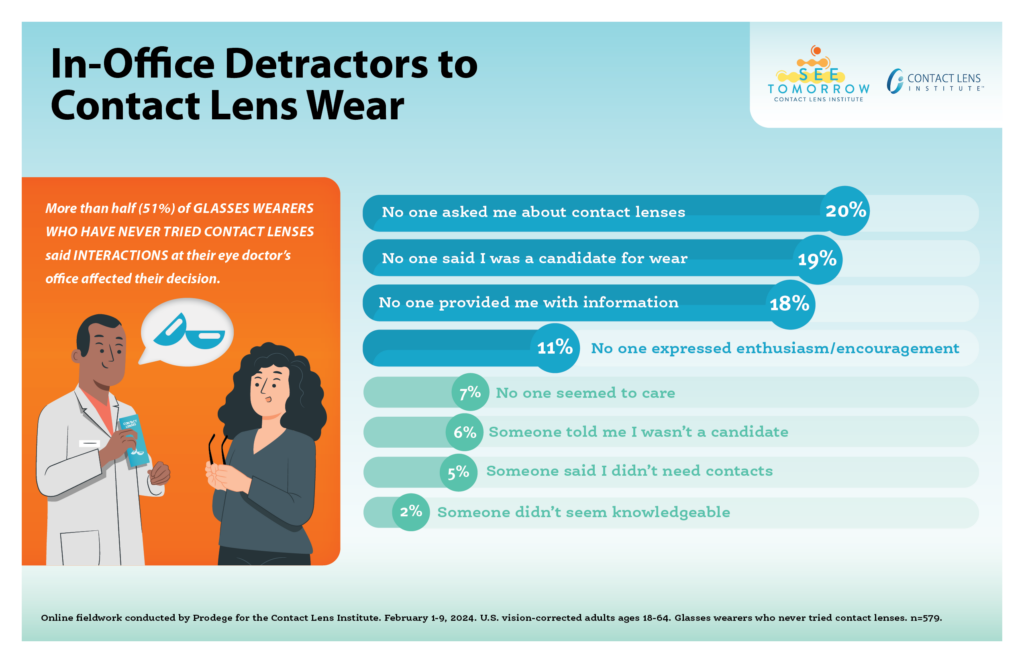 More than half (51%) of glasses wearers said their lack of contact lens trial was directly influenced by in-practice behaviors or lack thereof. Specific detractors included not having been asked about contact lenses (20%), not being told they were a candidate (19%), and not being provided with contact lens information (18%).