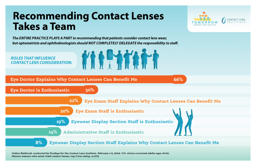 While underlining that the entire practice team should communicate the advantages of contact lens wear, the CLI research highlighted that the optometrist or ophthalmologist must not completely delegate that responsibility. The influence of the aforementioned doctor’s recommendation (66%) is markedly more influential among patients than recommendations from exam staff (22%) and from eyewear display staff (8%).