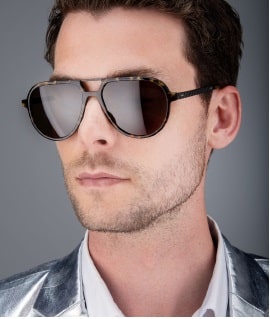 Graphic and artistic colorways enhance the custom acetate compositions, adding an exclusive and unique touch to these retro shapes. The front and temples are elevated by satin metal details, an iconic signature of the collection, which endows the frames with their distinctive and timeless character.