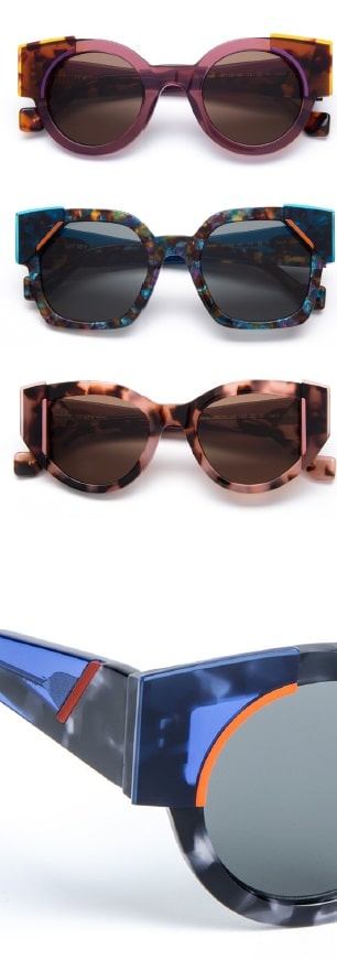 Artistic innovation and exceptional craftsmanship. These models are crafted from a triple laminate of acetate, creating a layered thickness effect at the corners of the eyes, while adding a striking geometric dimension to the frames.