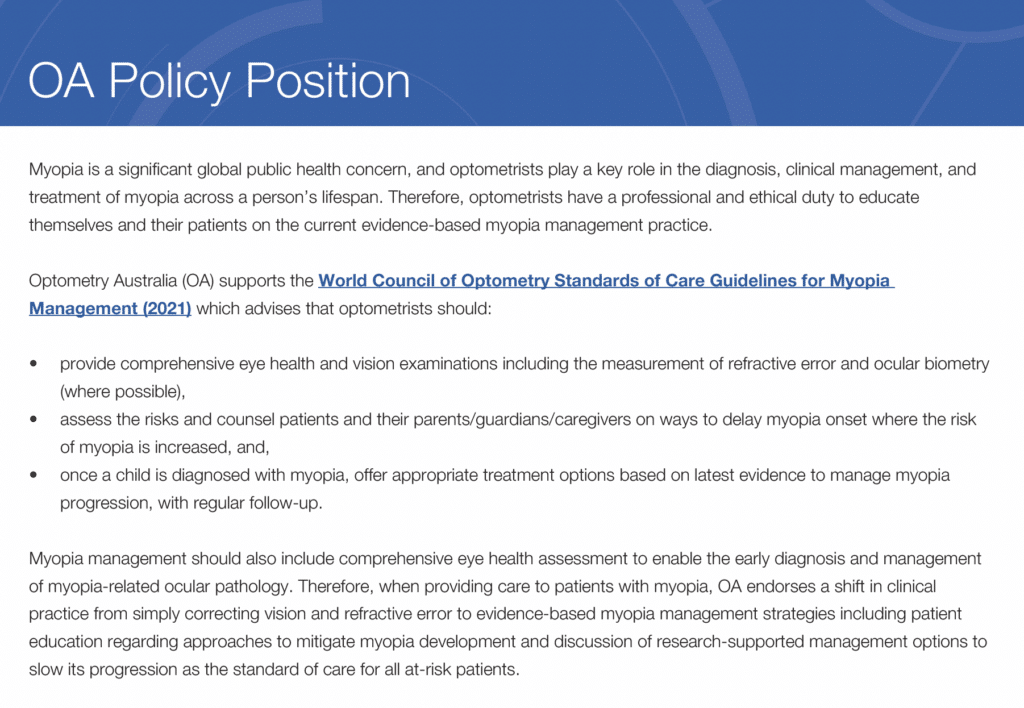 Optometry Australia (OA) has endorsed the World Council of Optometry (WCO) myopia management standard of care resolution. As part of its position statement, OA affirms the WCO resolution and supports a significant shift in clinical practice from merely correcting vision to employing strategies that slow myopia progression. OA recognizes that eye care professionals should focus on assessing myopia risk and offering preventive counseling in addition to regular comprehensive examinations.