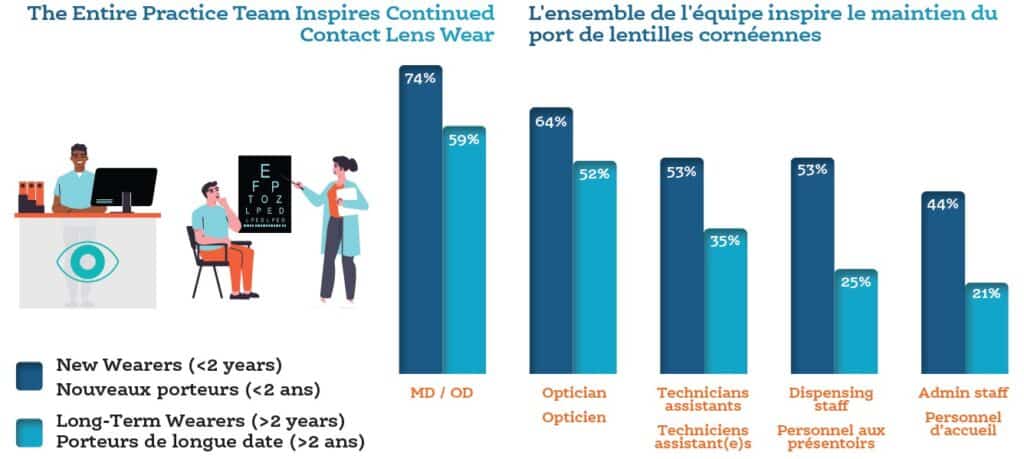 he study found that 74% of new wearers said their eye doctor had a substantial impact on their decision to continue wearing contact lenses, compared to 59% of long-term wearers. Opticians, technicians, and front-office staff also played an outsized role for new wearers, reinforcing the necessity of a comprehensive, practice-wide approach to patient engagement and support.