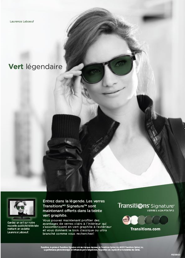 Ces ressources s’ajoutent à la nouvelle annonce télé de Transitions Optical qui diffuse une histoire plus classique et stylisée des verres adaptatifs, avec la comédienne canadienne Laurence Leboeuf, pour faire la promotion des verres TransitionsMD Signature™ vert graphite.