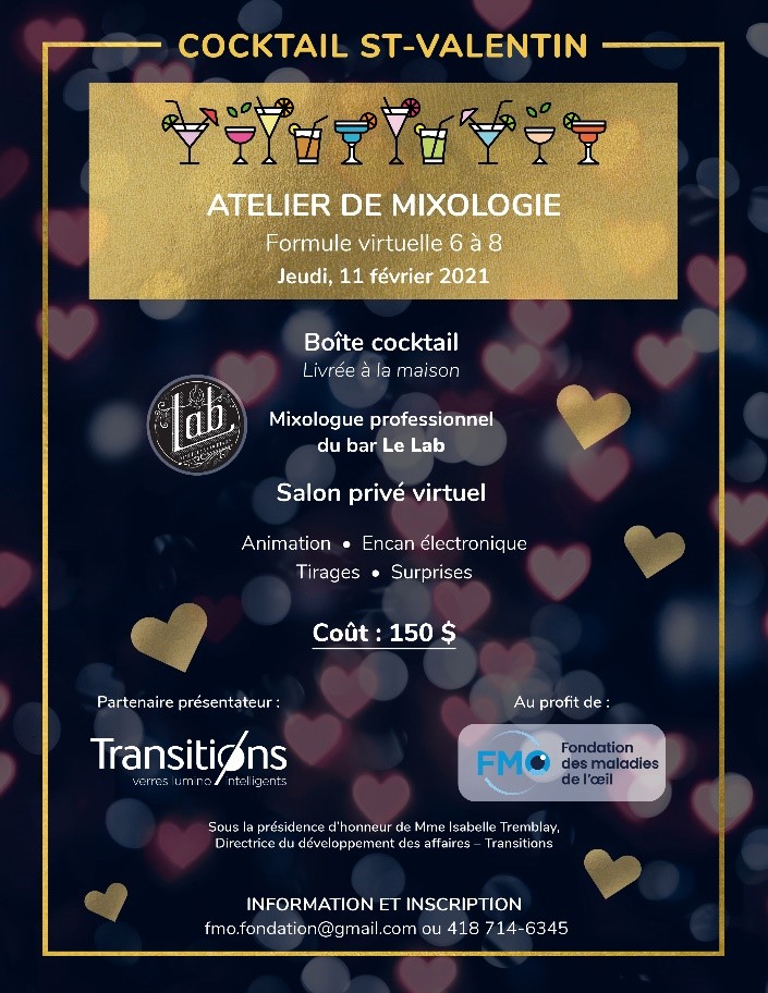 Transitions Optical a annoncé qu’elle sera le partenaire présentateur de l’atelier de mixologie de la Fondation des maladies de l’œil qui se tiendra le jeudi 11 février 2021. L’événement virtuel a pour thème la Saint-Valentin et permettra aux participants d’acheter une « boîte d’amour » comprenant des ingrédients de cocktails et d’autres articles de mixologie en lien avec la thématique. L’événement comprendra un encan électronique, de l’animation, un cours avec un mixologue professionnel, des tirages et d’autres surprises. Tous les profits de la levée de fonds iront à la Fondation des maladies de l’œil, dont la mission est de financer la recherche afin de prévenir les maladies oculaires et la cécité, en fournissant aux chercheurs le financement nécessaire pour mener à bien leurs recherches.