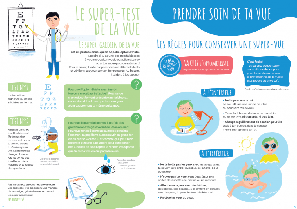 À travers des quizz ou des tests, le guide incite l’enfant à rencontrer un optométriste, « le super-gardien de la vue », afin de vérifier la bonne santé de ses yeux et dédramatiser le port des lunettes. « L’équipe lunettes », celle des super-héros !