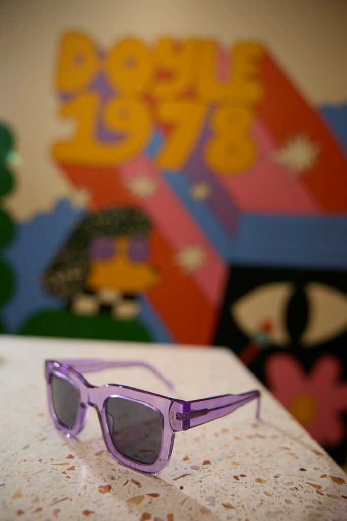 Doyle a voulu faire vivre cet œuvre à travers l’ensemble de ses boutiques et de sa marque maison Atelier78. Les admirateurs pourront donc découvrir le modèle de lunettes Verdun en version violet et solaire (avec verres antireflets), disponible en édition limitée et arborant la signature de l’artiste Chien Champion sur les branches. Ce modèle fait partie des nouveautés d’automne, une collection entièrement fabriquée en Italie, avec de l’acétate Mazzucchelli. Plusieurs déclinaisons sont prévues afin de faire découvrir au public ces illustrations, que ce soit des lingettes en microfibres, des sacs fourre-tout, de l’affichage à l’intérieur et à l’extérieur des boutiques Doyle au Québec.