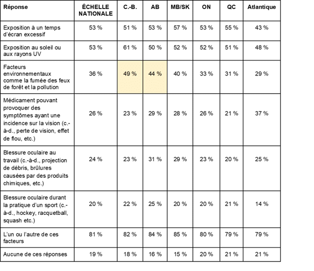 Quand il est question de leur santé oculaire, la majorité des Canadiens (81 %) sont préoccupés ou ont éprouvé au moins un facteur concernant leurs yeux et leur vision. Le temps excessif passé devant un écran, l’exposition au soleil ou aux rayons UV et des facteurs environnementaux comme la fumée des feux de forêt et la pollution constituent les trois principales préoccupations. Les Canadiens qui résident en Colombie-Britannique et en Alberta sont directement plus préoccupés par les facteurs environnementaux que ceux de l’Est du pays.