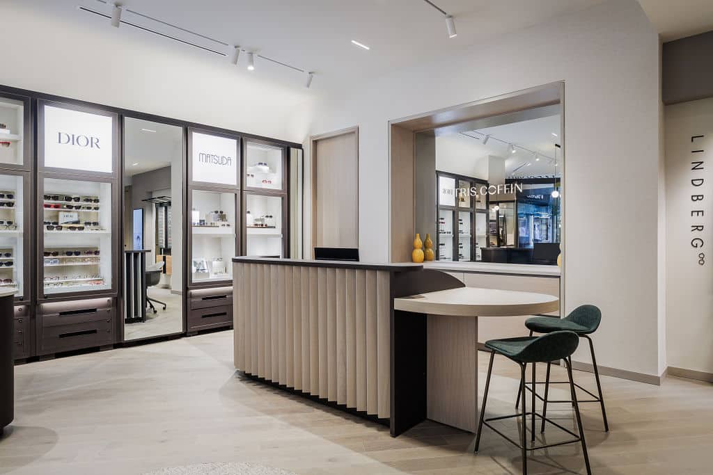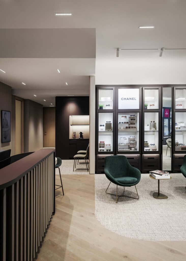 Afin d’optimiser cet espace restreint, seuls les modèles phares de chaque collection sont exposés, tandis que l’inventaire supplémentaire est discrètement rangé dans des tiroirs ultra-organisés sous les présentoirs. Cette approche transforme l’expérience d’achat, incitant les clients à interagir directement avec les montures qui les inspirent. L’atmosphère sophistiquée, les teintes monochromes chaleureuses, les accents boisés et les sièges luxueux créent un cadre accueillant, où l’élégance discrète invite à explorer à son propre rythme.