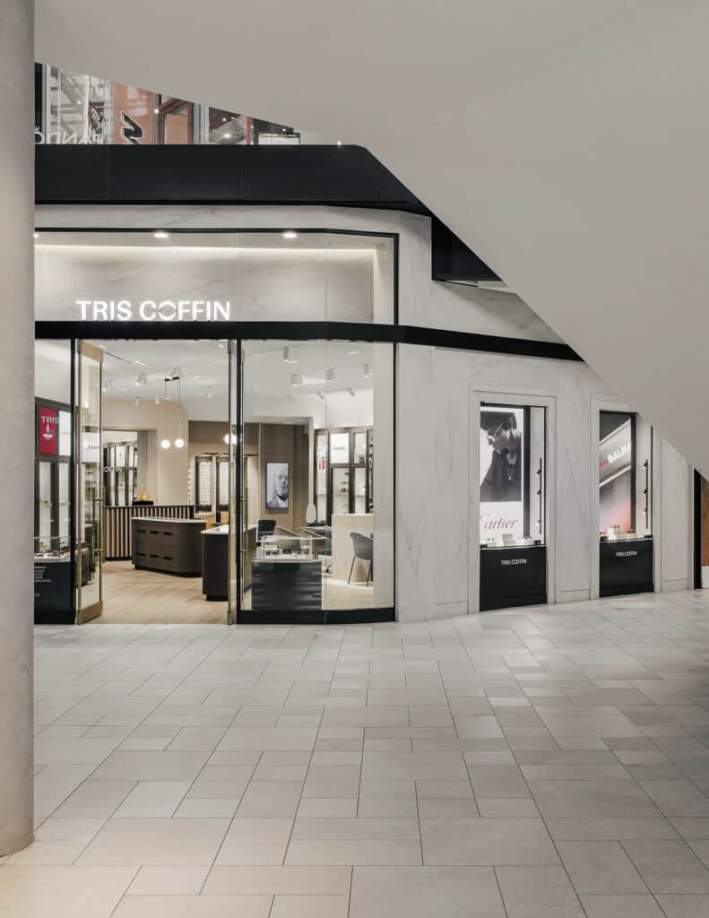 L’un des projets les plus saisissants est Tris Coffin, où Mario a collaboré avec l’équipe de New Look pour créer un espace optique hors du commun. Dès l’entrée, le design capte l’attention par son raffinement et son audace. La boutique évoque un écrin de joaillerie sur-mesure, avec des vitrines en verre et en bois, savamment disposées pour sublimer chaque monture de luxe. Un éclairage de pointe rehausse tant l’espace général que les présentoirs, mettant chaque monture en valeur avec une précision méticuleuse.